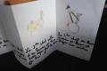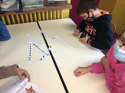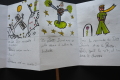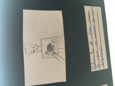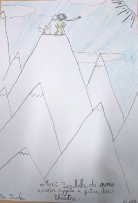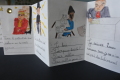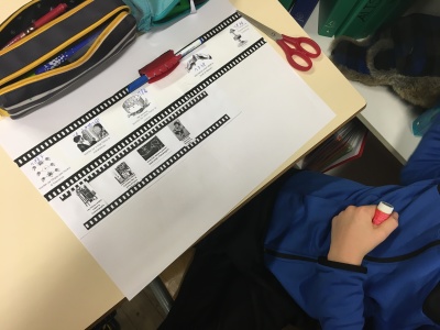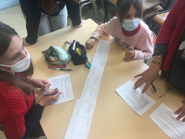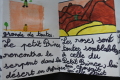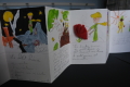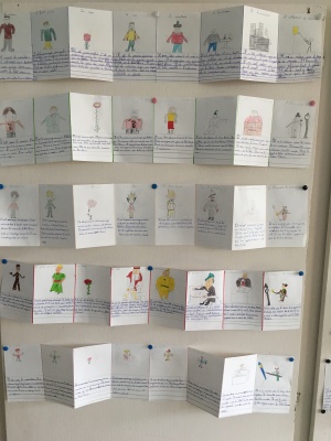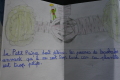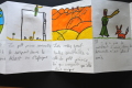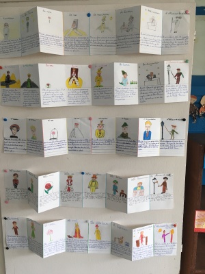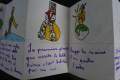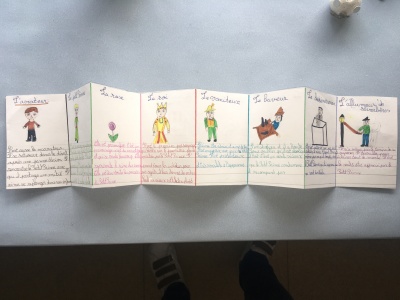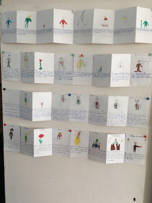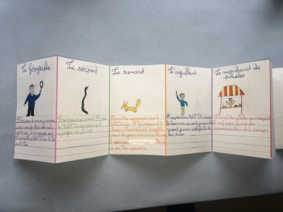 Pour les CM1 a, Les élèves représentent chaque grande étape du récit et recopient une réplique de ce passage. L'ensemble est présenté sous la forme d'un livret en accordéon.