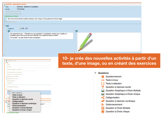 « Pour toutes mes formations je rentrais par une prise en main des activités. Je privilégiais « texte et multimédia » pour leur faire comprendre la logique de création du logiciel puis après c'était à la carte selon ce qui les intéressait le plus (le plus souvent média chapitré). »