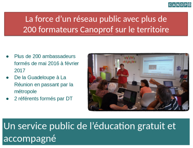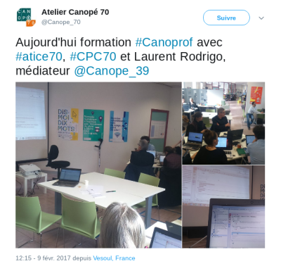 « Nous sommes en pour parler avec l'ESPE pour une formation en M1 l'an prochain où canoprof leur fournirai un cadre structurant pour le fiche de préparation et plus si affinité. Des ateliers libres ouverts à tous continueront à être proposés l'an prochain dans l'atelier Canopé. »
