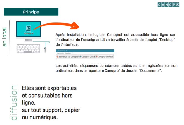 Un diaporama est commenté par le prof dès le début du cours. Les élèves ont une trace écrite reprenant les quiz de la présentation. Diaporama et trace écrite sont générés à partir des même sources CANOPROF. Seuls les quiz sont utilisés en commun sur les deux documents ; il n'y a pas de copier-coller.