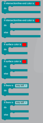 Les blocs de condition permettent de prendre des décisions en fonction de la couleur de la ligne qu'Ozobot détecte, (en fonction du bloc choisi : soit quand il arrive à une intersection ou une fin de ligne (intersection/line-end) soit la couleur de la ligne simplement).